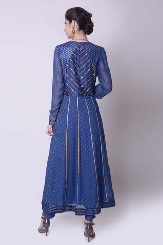 V neck anarkali with paneled bodice and mix embroidery. fitwise: this look is semi fitted at waist and bust. It comes with pant and dupatta.