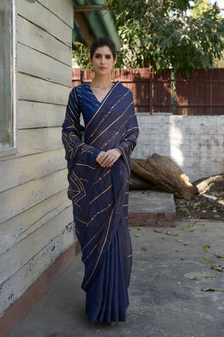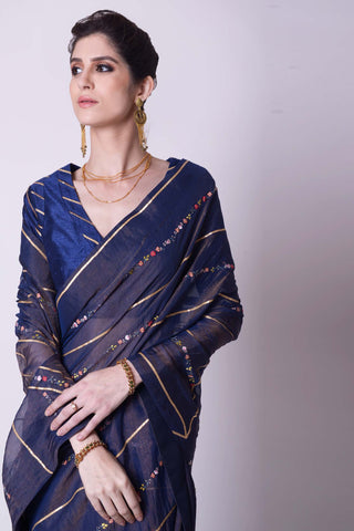 Silk shimmer ggt sari with small floral emb. Blouse fit: it has fitted blouse and it comes with stitched blouse.