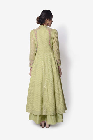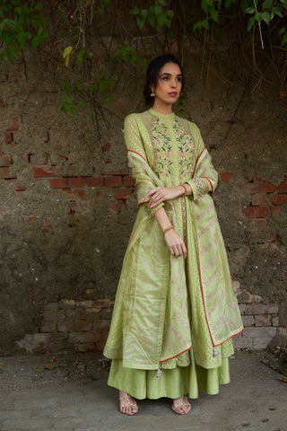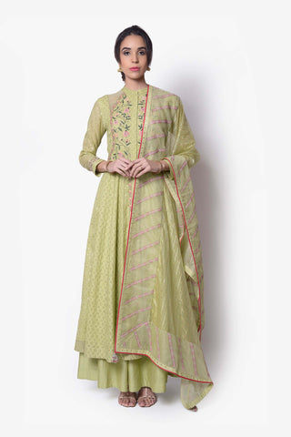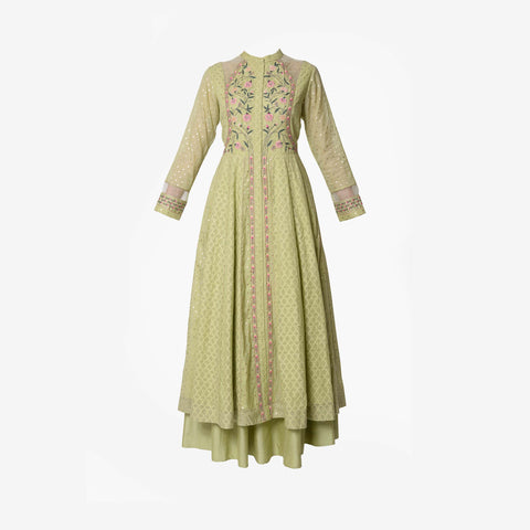 Shoulder yoke anarkali with 3d flower embroidery. fit wise: this style is semi fitted at waist and bust. This style comes with skirt and dupatta.
