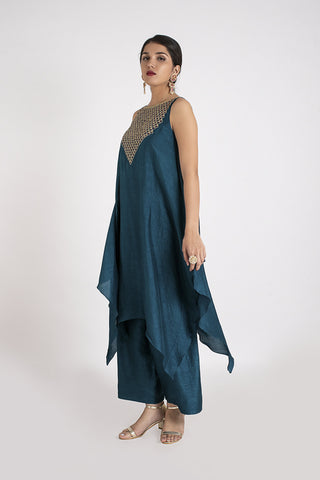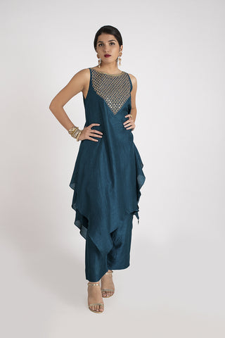 A teal co-ordinated sleeveless silk kurta and farsi pant with a mix of hand embroidered sequins, resham and dori work