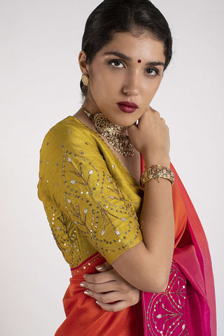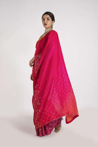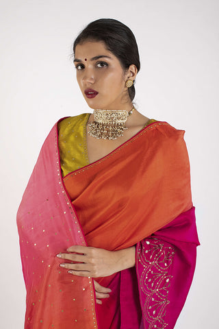 A handwoven dupion crepe saree in shades of pink and tangerine hand embroidered with sequins, cut dana, sari and goat work paired with a citrine hand embroidered silk blouse.