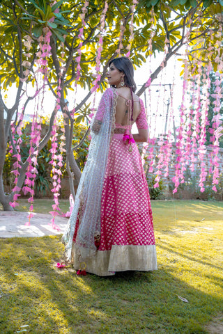 Featuring a pink shaded lehenga set in raw silk, net and chanderi base. It has ocean green duppata and tassels.