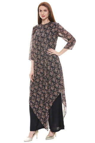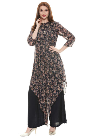 Featuring an asymmetrical printed kurta with embroidery highlights paired with flared palazzo pants.