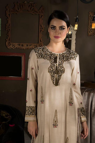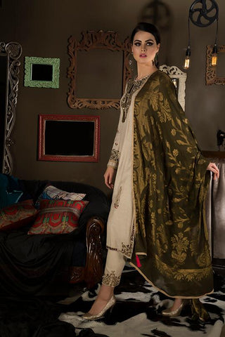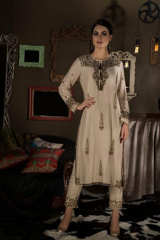 Beige kurta with embroidered yoke paired with cigarette pants and an olive dupatta.