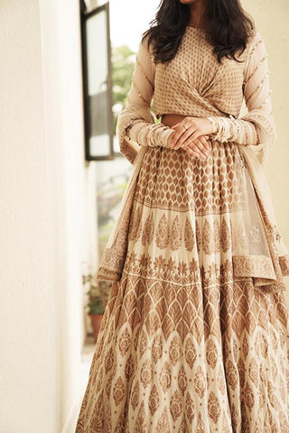 Featuring a beige blouse in jacquard base with tie-knot and zardosi embroidery. It is paired with a matching lehenga in banarasi moonga silk base.
