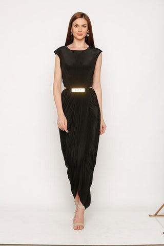 Featuring a printed free-style cape with solid black dress with metal buckle at the waist.