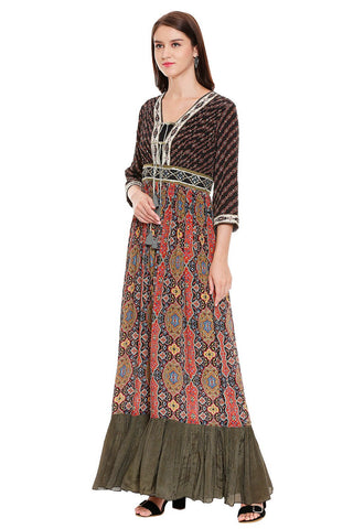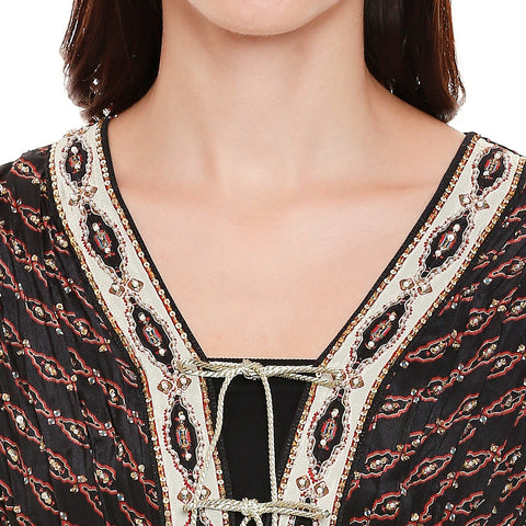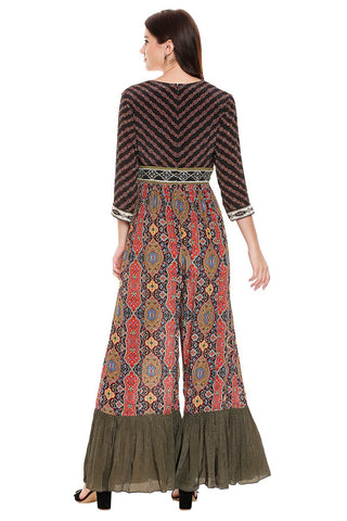 Featuring a printed jumpsuit dress with neck tie-ups and tier at the bottom.