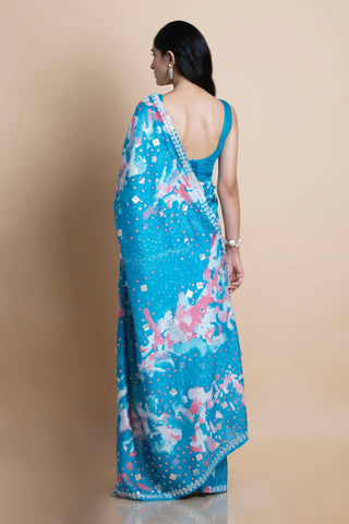 • Aqua Blue Printed and Embroidered Chanderi Saree -Chanderi