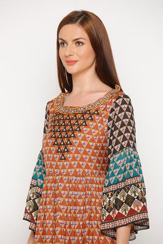 Featuring a brown printed dress with gathers on the sleeve and Mirror embroidery on yoke.