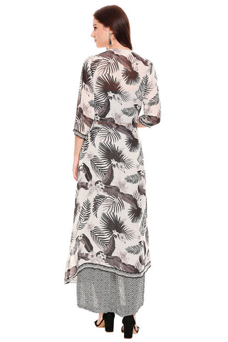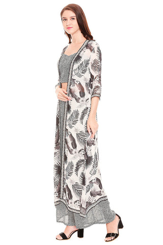 Featuring flared pants paired with a bustier spaghetti top and a long printed straight jacket.