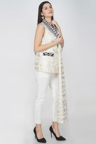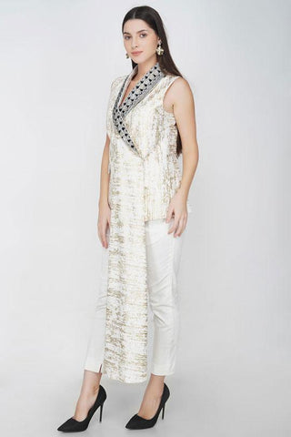 Cut sleeve style double-breasted foil printed blazer, has a long flap detailing, notched lapel collar with thread embroidery on it. White trousers with hook closure, zip fly and two pockets.