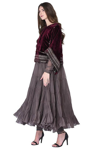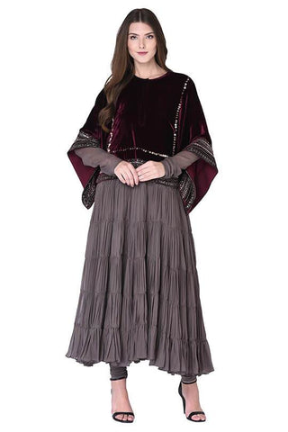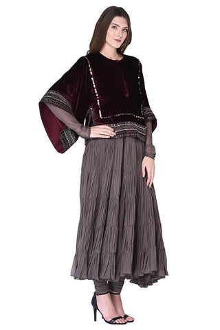 Featuring a dark grey pleated and embellished Anarkali paired with an adorned kaftan