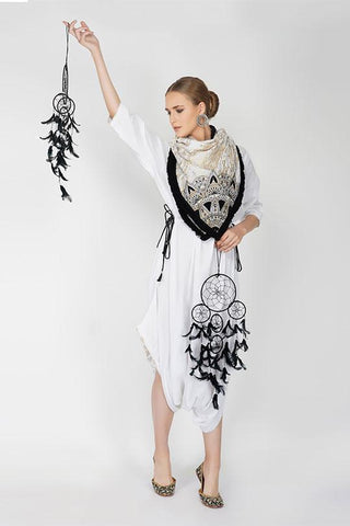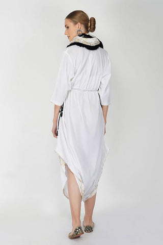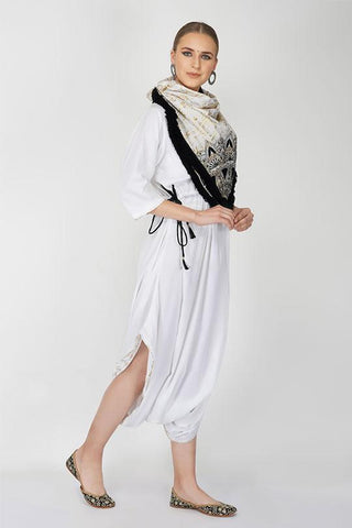 White mulmul fabric Dhoti Jumpsuit, has a keyhole neckline, has three-fourth length sleeves, has a concealed zip closure on back, has a black silk drawstring adjustment on the waist, dhoti style on bottom, calf length, foil printed piping detailing on sleeves, neckline and bottom of the dhoti. Comes with foil printed mulmul scarf with embroidery detailing on the corners and lace finishing on the sides.