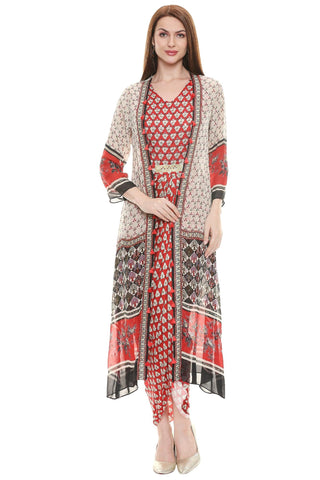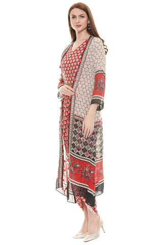 Featuring a printed drape dress with mirror work embroidery paired with chiffon printed jacket with embroidery highlights.