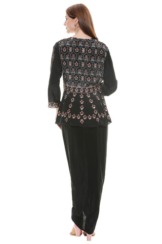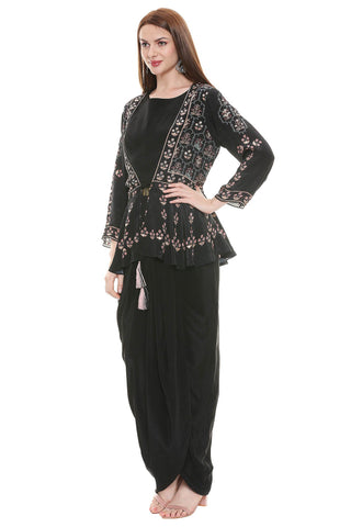 Drape dress with side cuts paired with jacket embellished with mirror and thread embroidery and tie up detail.