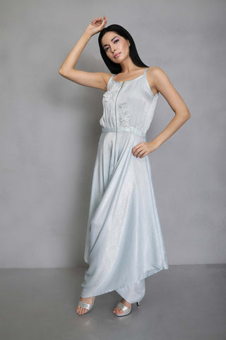 Featuring an embellished bias drape jumpsuit with 3D floral embroidery. Made to order in blue/pink/white.