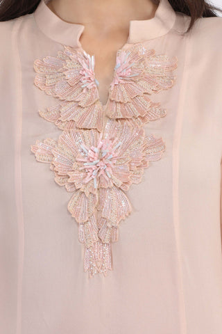 Featuring an embellished tunic with 3D floral embroidery and sleeve detail. Note - Pants are for styling only. Made to order in white/blue /powder pink.