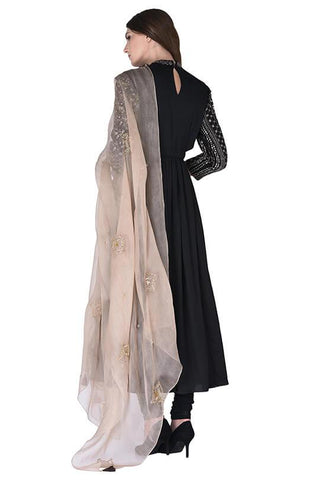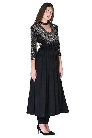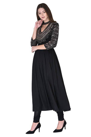 Anarkali ensemble in black tone, classic cut and enhanced with the delicate work of hand embroidery.
