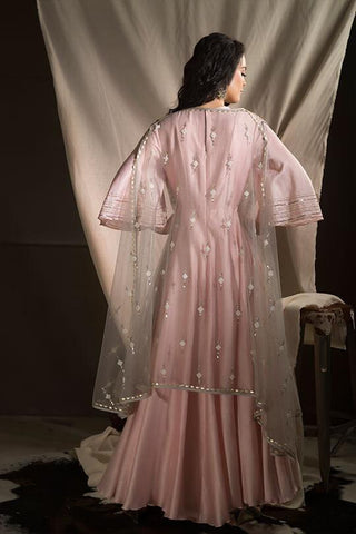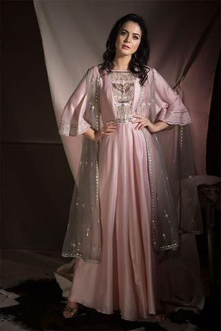 Pink embroidered Chanderi anarkali gown with classic bell sleeves and sheer grey embroidered cape-style dupatta