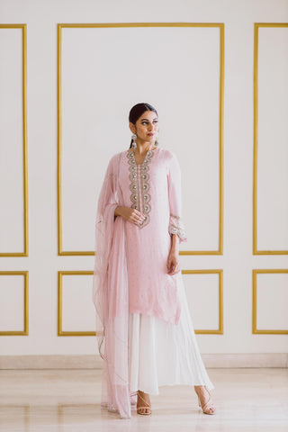 Pink georgette kurta with heavy zardosi embroidery at neckline and scallop-shaped flared sleeves. It is paired with white kalidar palazzo and pink dupatta with laheria style sequences and lace details.