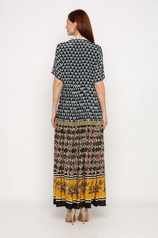 Featuring a printed dress pleated at the waist and placket is enhanced with embroidery.