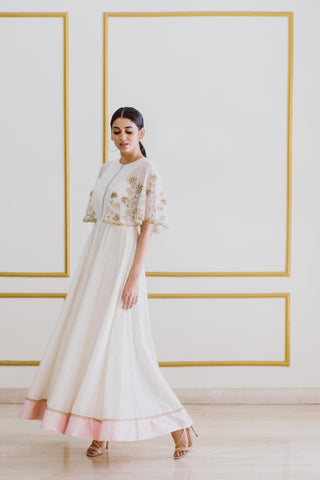 White chanderi gown with heavily embroidered butterfly sleeves. It has sheer neckline details at the front and pink satin border and lace details as the hemline.