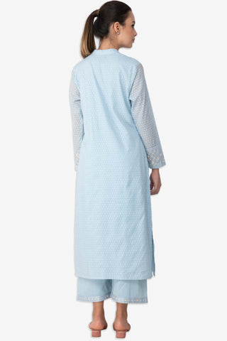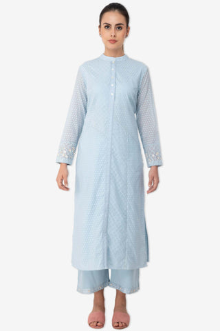 A fabric mix paneled tunic. fit wise: this style has relax fit. This style comes with straight pant and embroidered dupatta in silk organza.