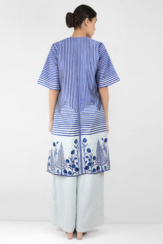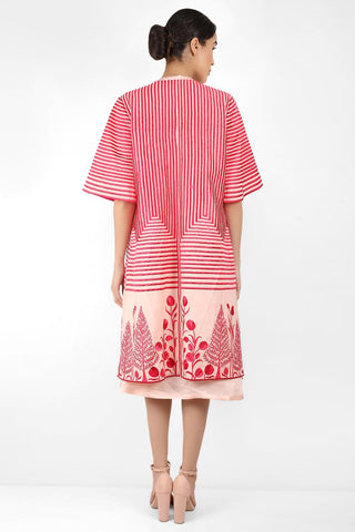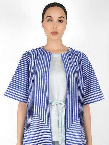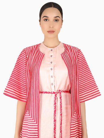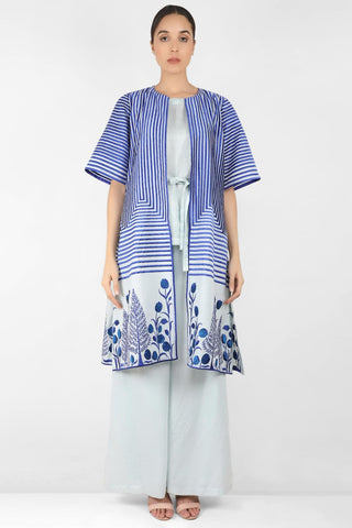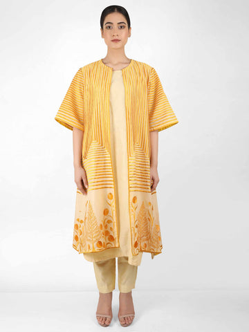 Featuring a cotton chanderi long jacket with half sleeve embellished with multi shades of orange thread embroidery in stripes and floral motifs. The jacket is front open with piping on yellow satin and on sleeve bottom.