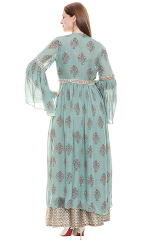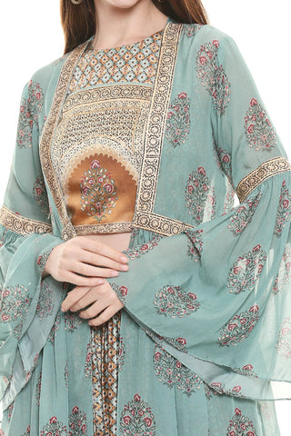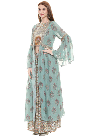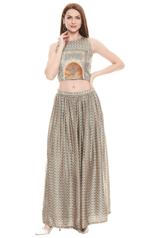 Featuring a printed crop top paired with high waist box pleated skirt paired with printed jacket which has bell sleeves.