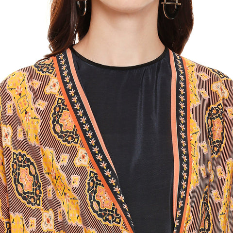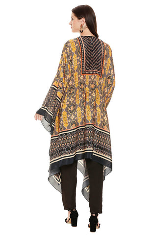 Featuring a printed asymmetrical top with front tie-ups paired with straight pants.