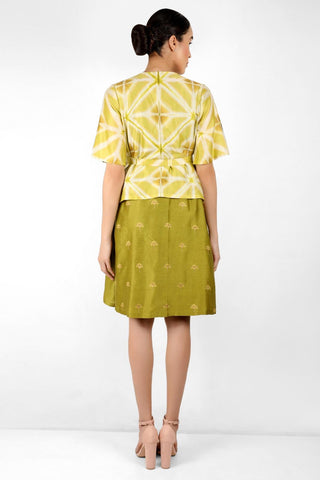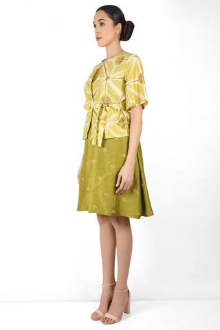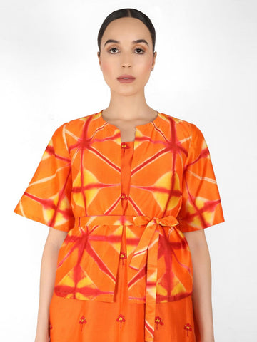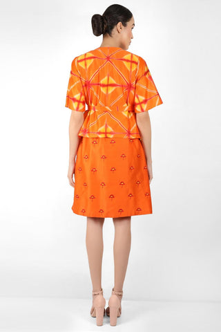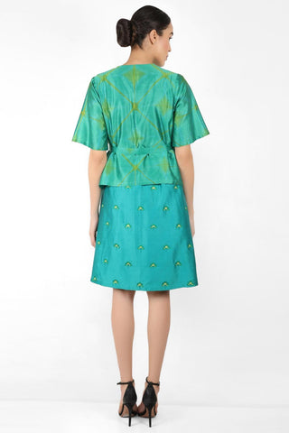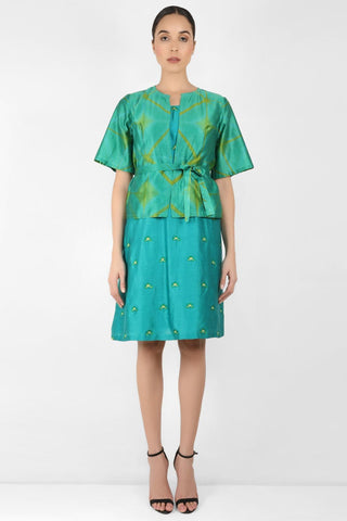 Featuring a print chanderi jacket with a line chanderi tunic. The tunic inside has a boat neck embellished with small floral bootis all over the tunic using a multicolor thread with aari technique.