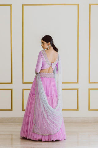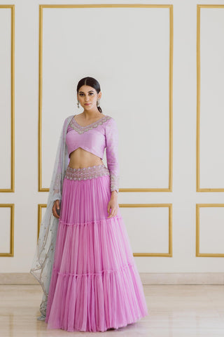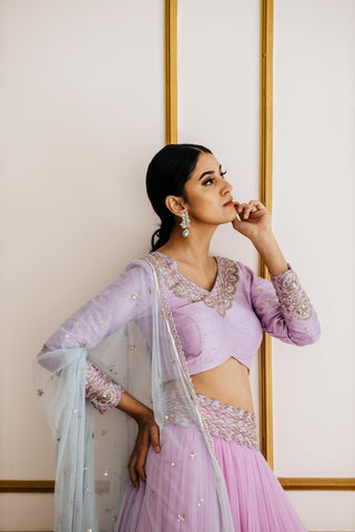 Lavender tiered skirt with hand-embroidered belt and heavily embroidered fully sleeves raw silk blouse. It comes with tulle ice blue sequin dupatta.