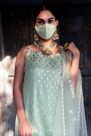 Featuring a deep neck light green suit with enhanced neckline and light embroidered dupatta and kalidar sharara. The modern stylish suit is made in brocade chanderi fabric with sharara of plain chanderi.