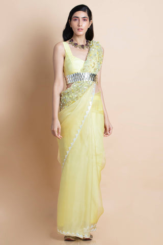 Lime Yellow Hand embroidered Silk Organza Saree. - Pure Silk Organza Base -It is intricately hand-embroidered in zardozi in tonal shades on 2.25m pallu - Hand embroidered border-This comes with matching blouse piece in chanderi and matching underskirt fabric in shantoon.