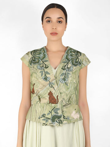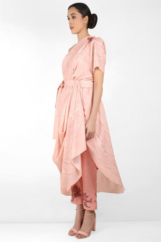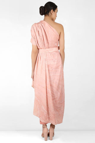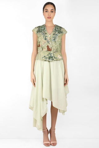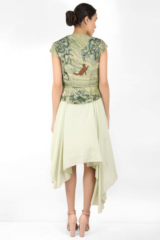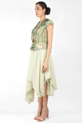 Featuring a yellow marble printed satin chanderi jacket with muslin draped tunic. The jacket has a front opening with a waist belt.