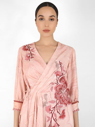 Featuring a Rose Gold satin cotton angrakha style tunic with matching solid satin georgette dhoti pants. Embroidered with multicolor thread embroidery using aari technique with floral and animal motifs like cat, squirrel and rabbit. The cuff has lace detailing.