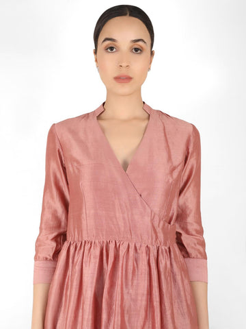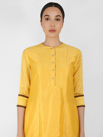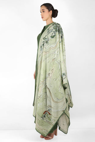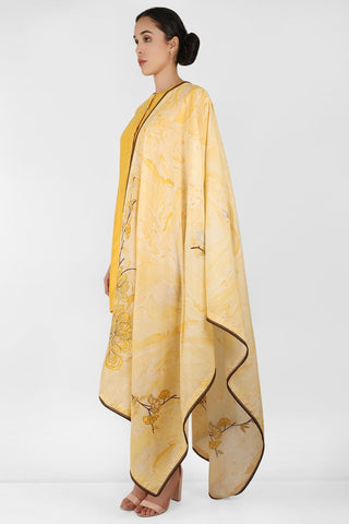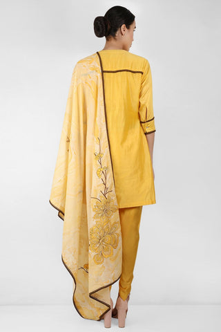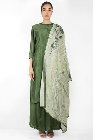 Featuring an angrakha style chanderi tunic with straight satin chanderi pants and marble printed dupatta on muslin fabric. The dupatta is embroidered with multi-color thread embroidery using aari technique with floral and animal motifs like cat, squirrel and rabbit with lace finishing all around the dupatta.