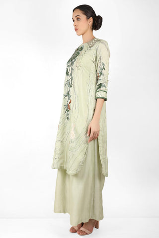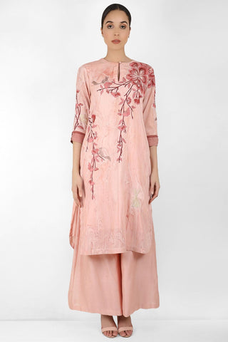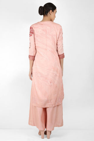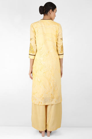 Featuring a cotton satin marble printed straight tunic with round bottom and a cotton silk chanderi palazzo pants. The tunic has a side opening with a loop and buttons. The sleeve has a cuff with lace detailing on each side of the cuff.