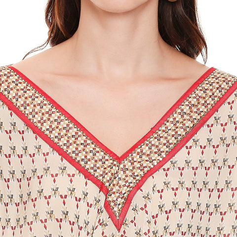 Featuring a maroon v-neck asymmetrical printed top paired with pants.