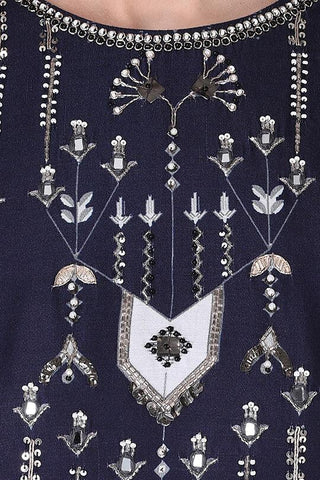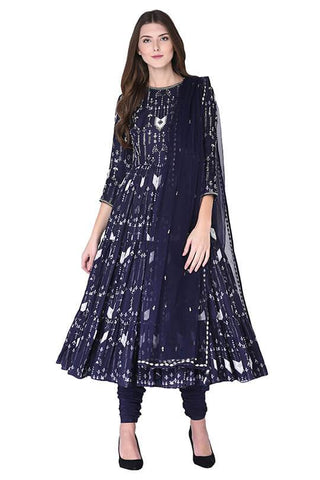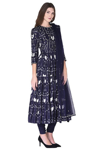Featuring navy blue printed and embroidered, tiered Anarkali paired with churidar and dupatta.