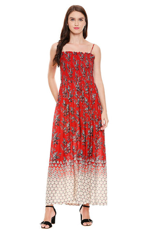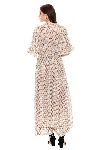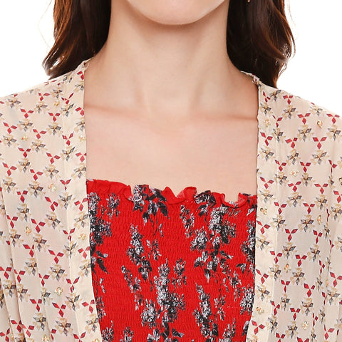 Featuring a smocking noodle strap printed dress paired with a printed jacket with waist tie-ups.