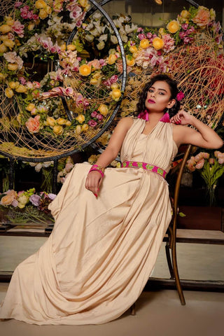 Sleeveless design with front cowl drape with stylish French knot hand embroidered belt.