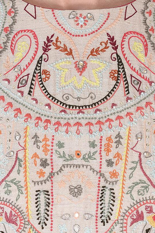 Featuring a beige embroidered kurta paired with peach sharara bottoms and a dupatta.