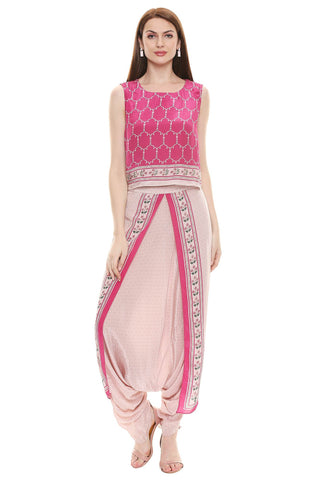 Printed crop top paired with straight jacket embellished with mirror and thread work is paired with printed dhoti pants.