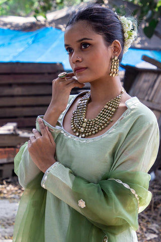 The short length top style kurta with kalidar sharara in pistachio green garment is enhanced by embroidery in dupatta, neckline, collar and deep rounded back neckline.