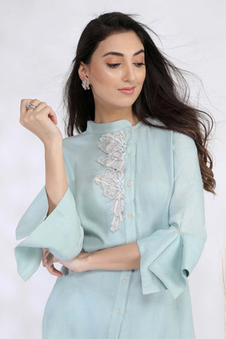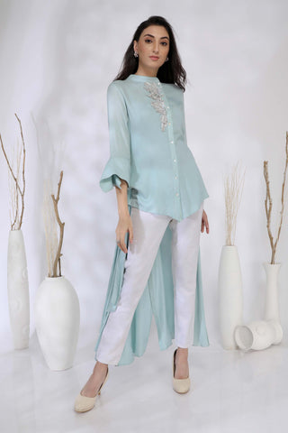 Asymmetric high low shirt embellished with 3D floral embroidery. Note - Pants are for styling only.