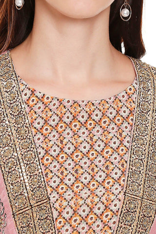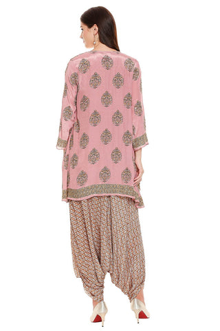 Featuring a printed dhoti jumpsuit paired with an asymmetrical jacket enhanced with zardozi embroidery.