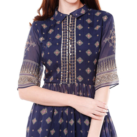 Featuring a printed gathered top with antique gold highlights paired with a satin dhoti draped skirt.