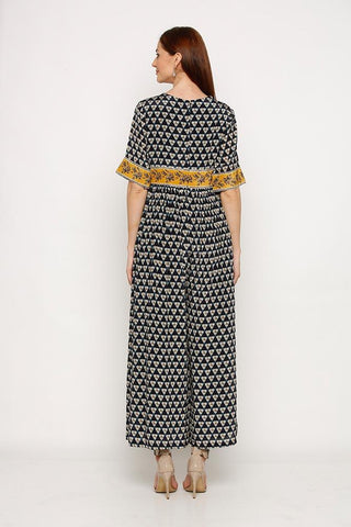 Featuring a printed Jumpsuit highlighted with embroidery on the neckline and waist.