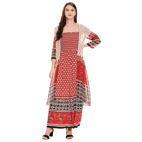 Red wide-legged jumpsuit with placement floral motif work & smocked bodice. Comes with contrast printed jacket.